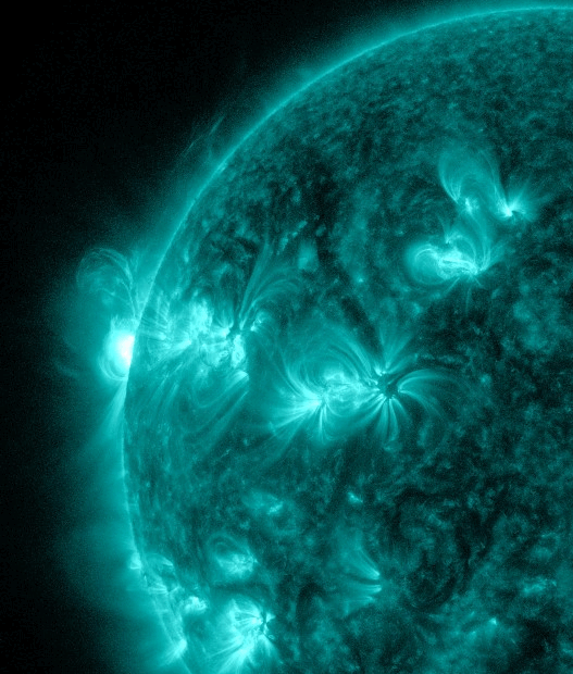 Auf der uns abgewandten Seite der Sonne kam es zum bislang stärksten Strahlungsausbruch (auch Flare genannt) in diesem Jahr. Diese Aufnahme der NASA-Sonde SDO (Solar Dynamics Observatory) zeigt den Strahlungsausbruch im UV-Licht.